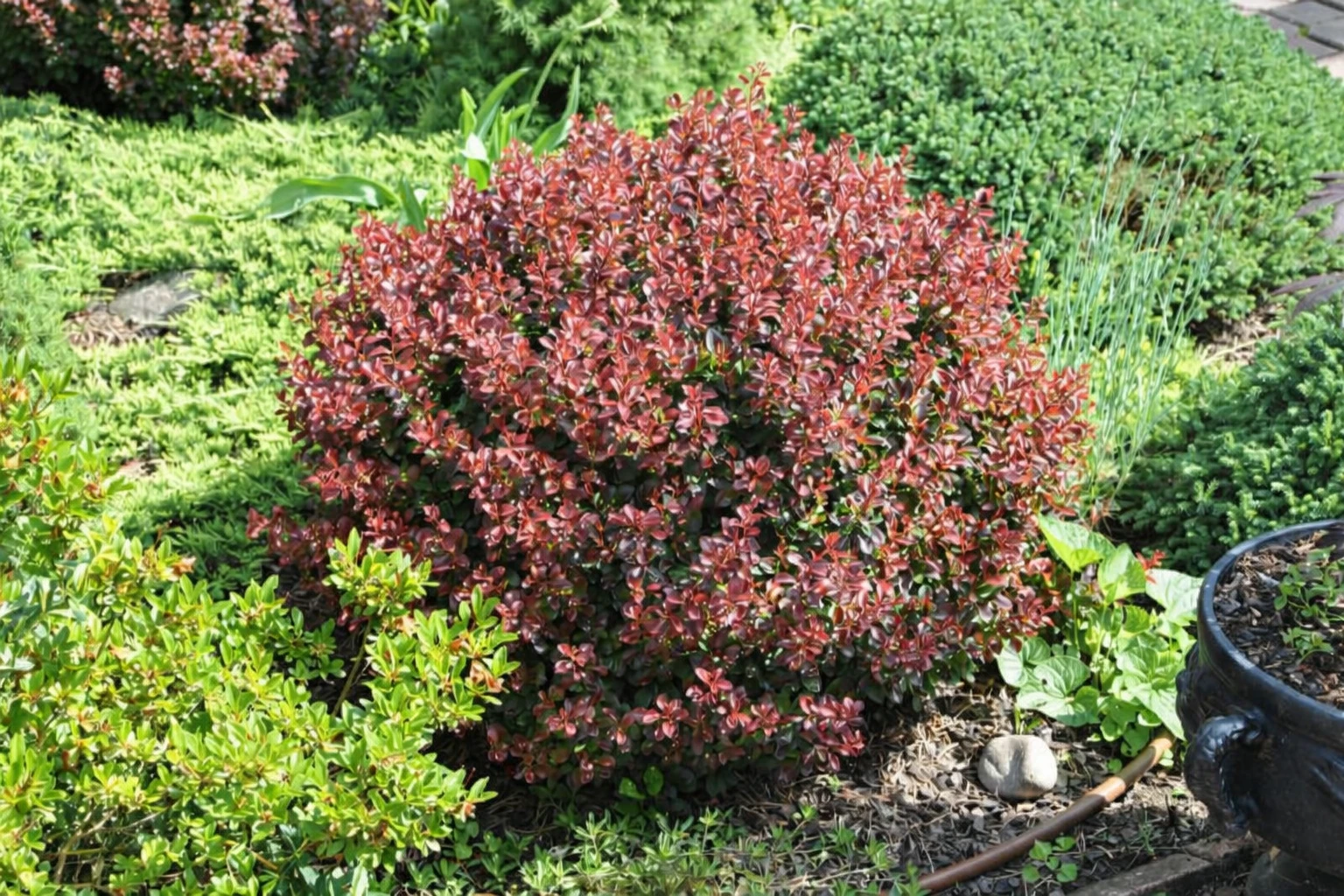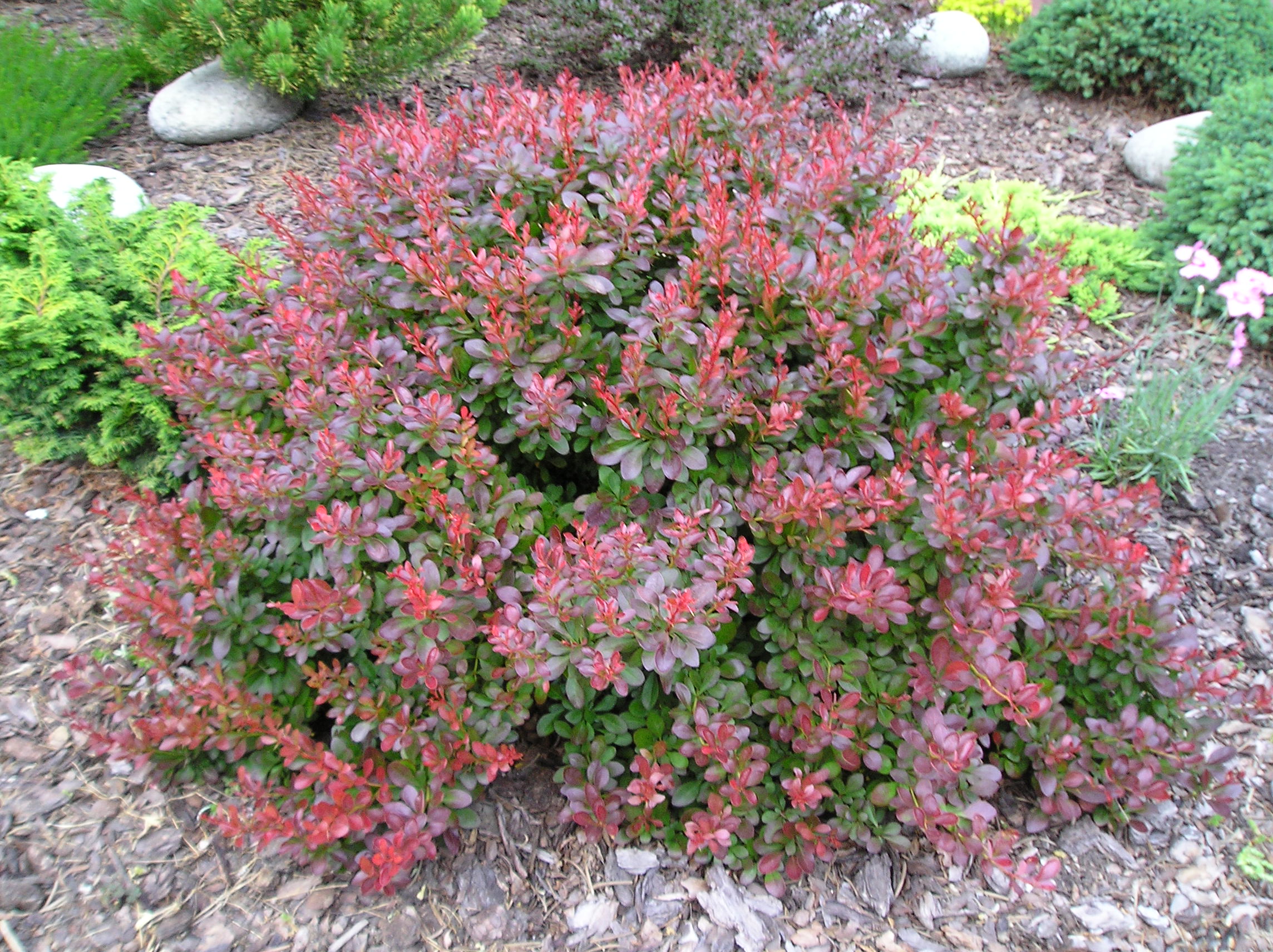 Berberys Thunberga ‘Atropurpurea Nana’ (Berberis thunbergii ‘Atropurpurea Nana’) to karłowy, wolno rosnący krzew liściasty o zwartym, płaskokulistym pokroju, osiągający około 0,5–0,6 m wysokości. Tworzy gęste, sztywne pędy z krótkimi cierniami, dobrze znoszące cięcie. Liście są drobne, purpurowe przez cały sezon, jesienią przebarwiają się na intensywne czerwienie. Najlepiej rośnie na stanowiskach słonecznych, gdzie wybarwienie jest najsilniejsze, choć toleruje lekki półcień. Preferuje gleby przepuszczalne, umiarkowanie wilgotne, od lekko kwaśnych po słabo zasadowe. Odporny na mróz i wiatr. Polecany na niskie żywopłoty, obwódki rabat, do ogrodów skalnych oraz uprawy w pojemnikach.