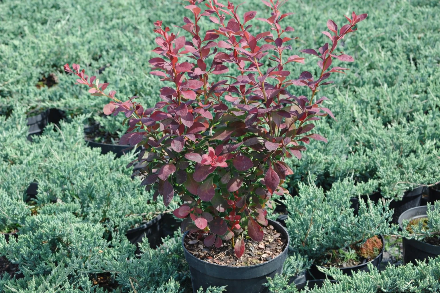 Berberys Thunberga ‘Golden Ring’ (Berberis thunbergii ‘Golden Ring’) to dekoracyjny, ciernisty krzew liściasty o wyprostowanym, z czasem lekko rozłożystym pokroju, dorastający zwykle do 1,5–2 m wysokości. Jego największym atutem są purpurowoczerwone liście z wyraźnym, wąskim żółtym obrzeżeniem tworzącym charakterystyczny „pierścień”, widoczny z większej odległości. Wiosną pojawiają się drobne, żółte kwiaty, a jesienią liście przebarwiają się na ciepłe odcienie czerwieni i pomarańczu. Najlepiej rośnie na stanowiskach słonecznych lub lekko półcienistych. Preferuje gleby przepuszczalne, umiarkowanie wilgotne, od lekko kwaśnych po zasadowe. Dobrze znosi suszę, mróz i warunki miejskie. Polecany na żywopłoty, szpalery, nasadzenia pojedyncze oraz do barwnych kompozycji ogrodowych.