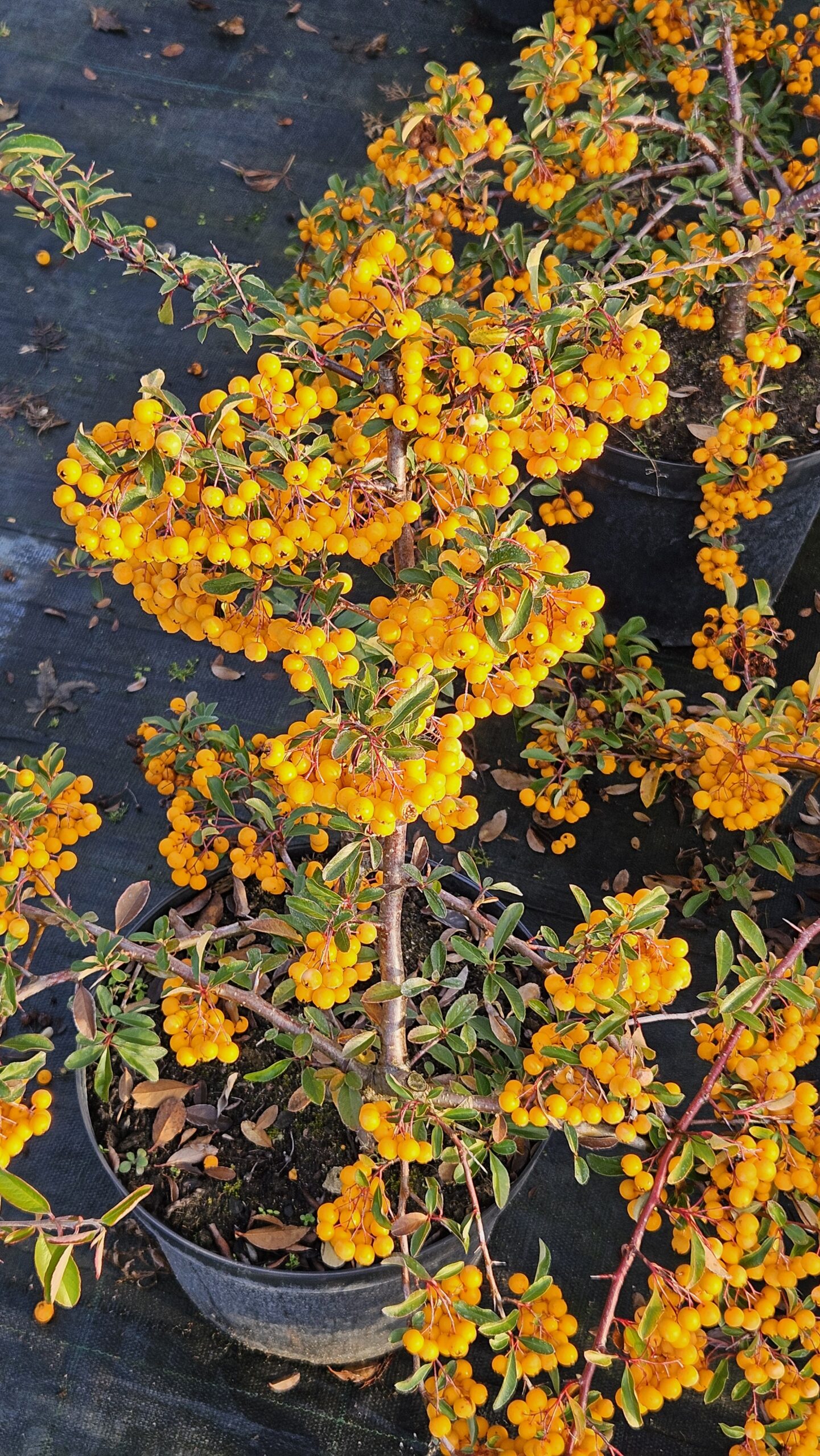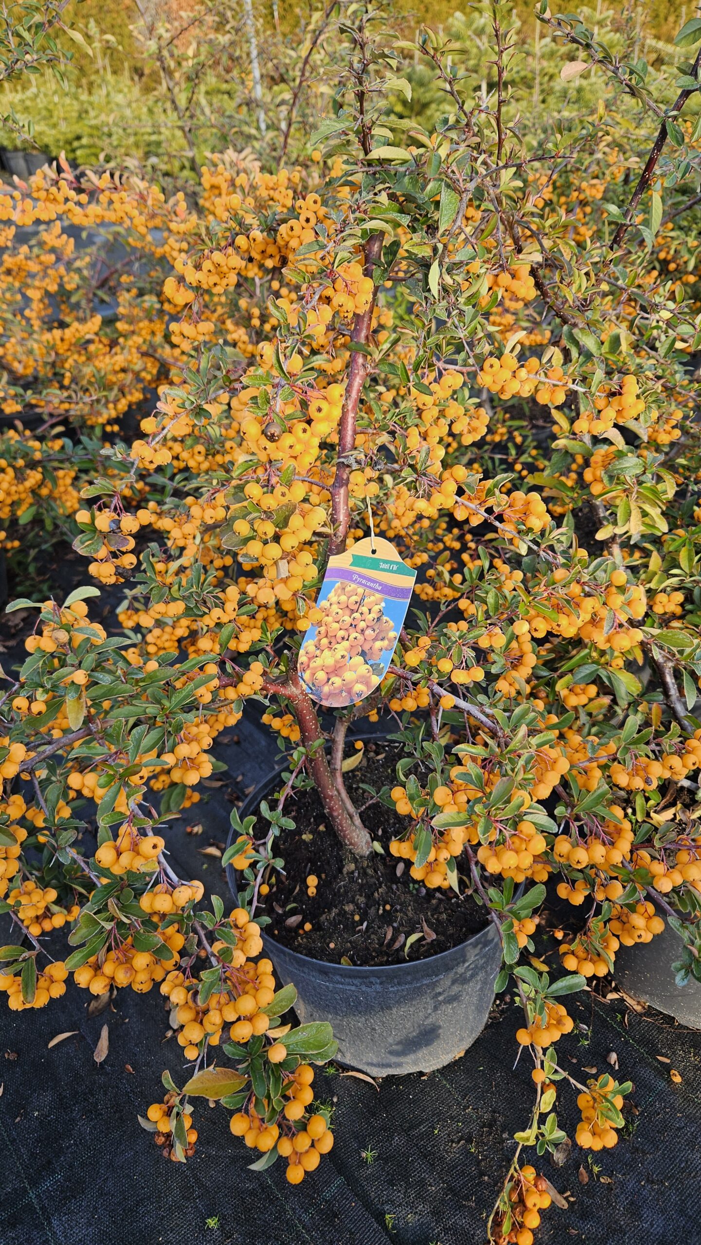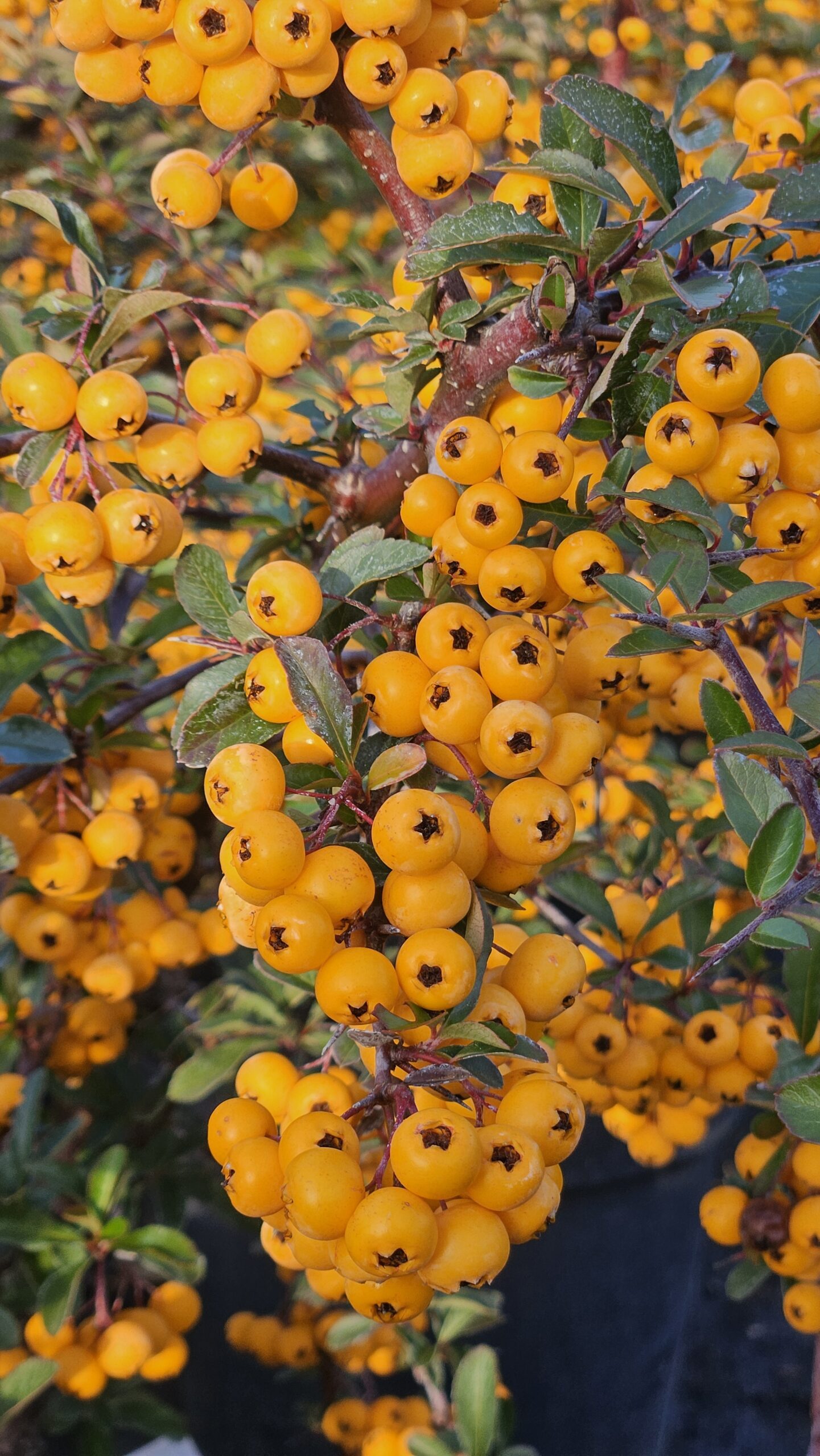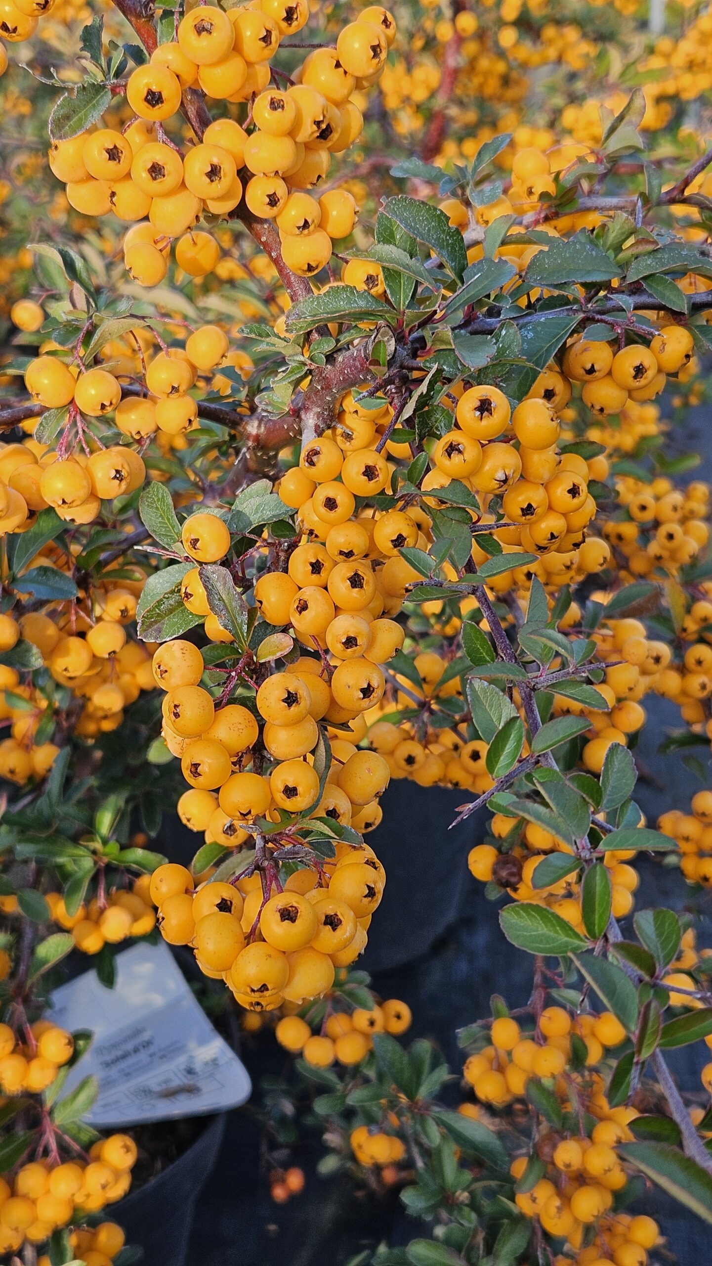 Ognik 'Soleil d’Or’ (Pyracantha ’Soleil d’Or’) to rozłożysty, ciernisty krzew ozdobny dorastający do około 1,5–2 m wysokości i podobnej szerokości. Liście są ciemnozielone, błyszczące i skórzaste – w łagodniejsze zimy pozostają na roślinie, natomiast w surowszych warunkach krzew zachowuje się półzimozielono. Na przełomie maja i czerwca pojawiają się liczne, drobne białe kwiaty, rozwijające się na pędach dwuletnich, co warto uwzględnić przy cięciu. Jesienią roślina niemal całkowicie pokrywa się kulistymi, intensywnie żółtymi owocami, które utrzymują się długo i stanowią jej największą ozdobę. Najlepiej rośnie na stanowiskach słonecznych, ciepłych i osłoniętych od wiatru, na glebach żyznych, piaszczysto-gliniastych lub gliniastych. Dobrze znosi suszę i warunki miejskie, sprawdza się w ogrodach, parkach, zieleni osiedlowej oraz jako formowany lub swobodny obronny żywopłot.