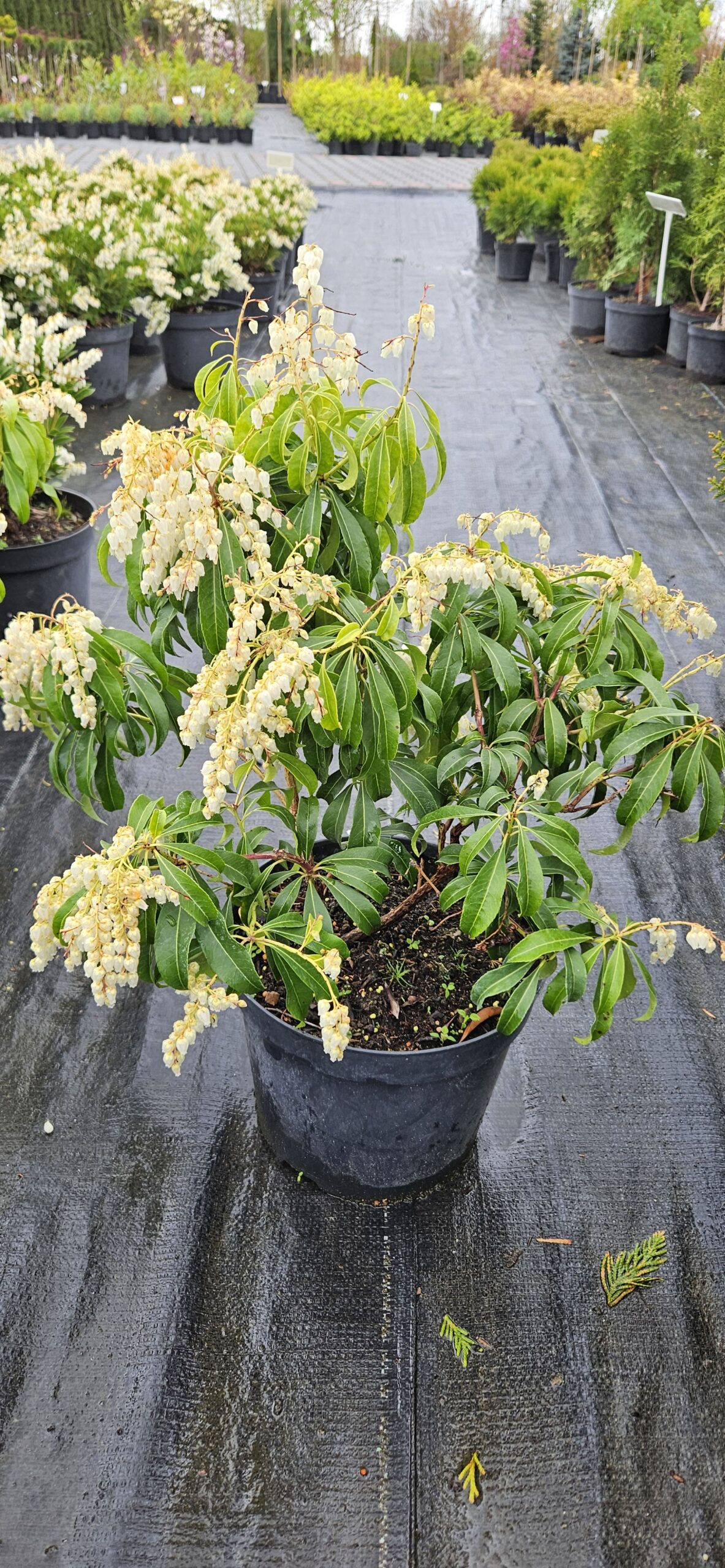 Pieris japoński ‘Red Mill’ (Pieris japonica ‘Red Mill’) to zimozielony krzew o zwartym pokroju, dorastający zwykle do około 1,5 m wysokości. Rośnie umiarkowanie szybko, tworząc gęstą, harmonijną sylwetkę bez potrzeby formowania. Najważniejszą cechą wyróżniającą odmianę są intensywnie karminowoczerwone, wiosenne przyrosty, które silnie kontrastują z ciemnozielonym, błyszczącym ulistnieniem i nadają roślinie wyjątkową dekoracyjność. Wczesną wiosną pojawiają się jasne, wiechowate kwiatostany, subtelnie podkreślające walory liści. Krzew najlepiej rośnie na stanowiskach półcienistych, ale poradzi sobie również w cieniu (słabsze wybarwienie przyrostów) lub na zacisznym stanowisku słonecznym. Wymaga gleb kwaśnych, próchnicznych, przepuszczalnych i umiarkowanie wilgotnych oraz stanowisk osłoniętych od mroźnych, wysuszających wiatrów. Polecany do ogrodów przydomowych, wrzosowisk oraz nasadzeń z innymi roślinami kwasolubnymi.