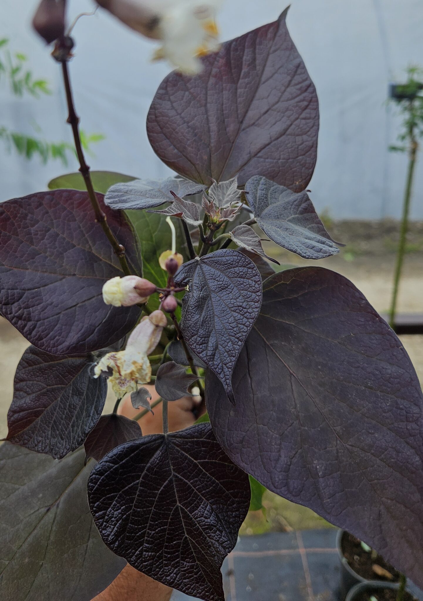 Surmia (Katalpa) pośrednia ‘Purpurea’ (Catalpa × erubescens ‘Purpurea’) to efektowne, średniej wielkości drzewo o umiarkowanym tempie wzrostu, dorastające zwykle do 8–10 m wysokości. Tworzy szeroką, lekko eliptyczną koronę i wyróżnia się dużymi, sercowatymi liśćmi, które wiosną rozwijają się w intensywnych odcieniach purpury i brązu, a z czasem zielenieją. Latem pojawiają się okazałe, białe kwiaty zebrane w duże wiechy, a po nich długie, dekoracyjne strąki utrzymujące się na drzewie przez zimę. Najlepiej rośnie na stanowiskach słonecznych i osłoniętych, w glebach żyznych, głęboko uprawionych i umiarkowanie wilgotnych. Doskonale sprawdza się jako soliter w ogrodach przydomowych, zieleni osiedlowej i parkach, gdzie stanowi wyrazisty akcent kolorystyczny.