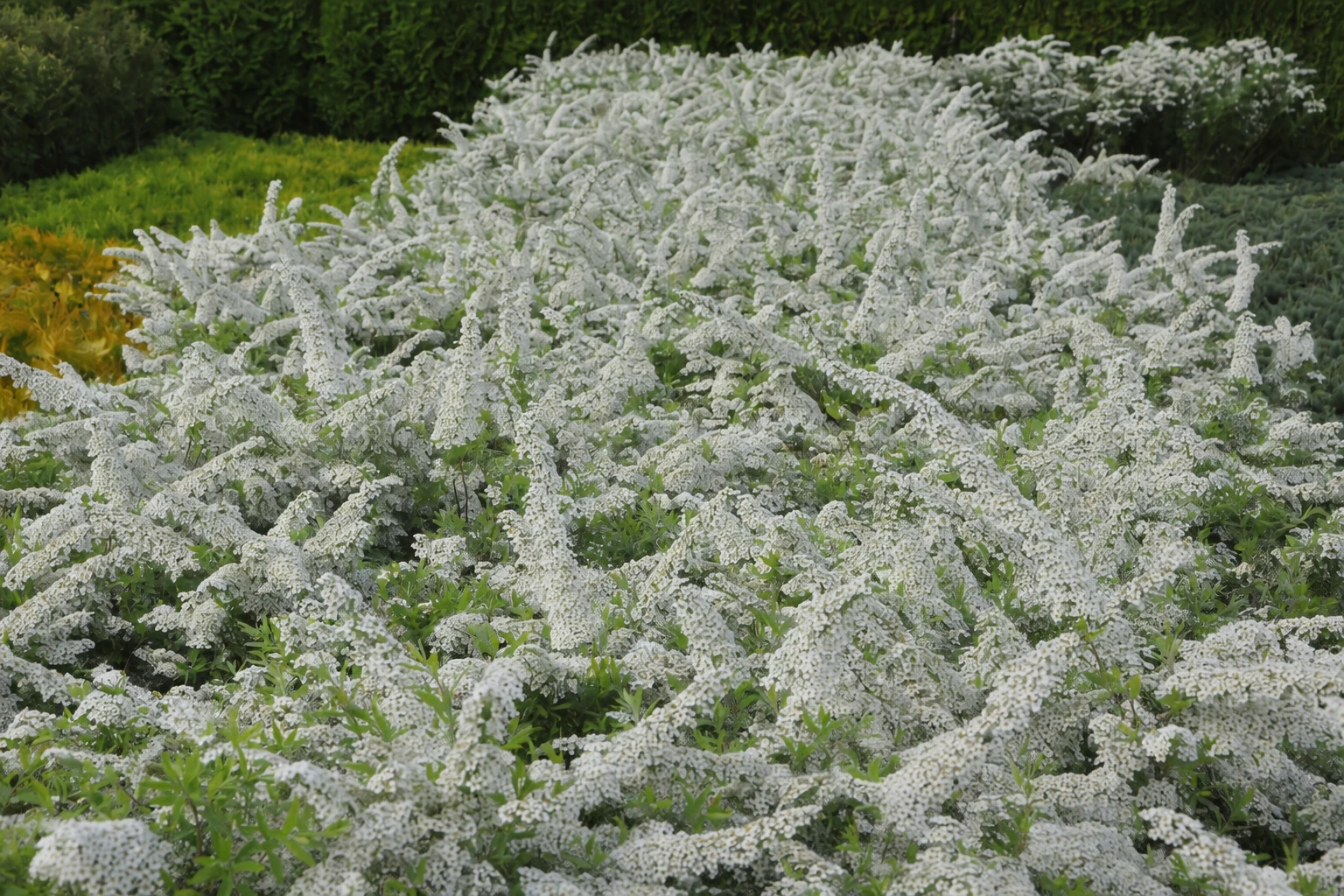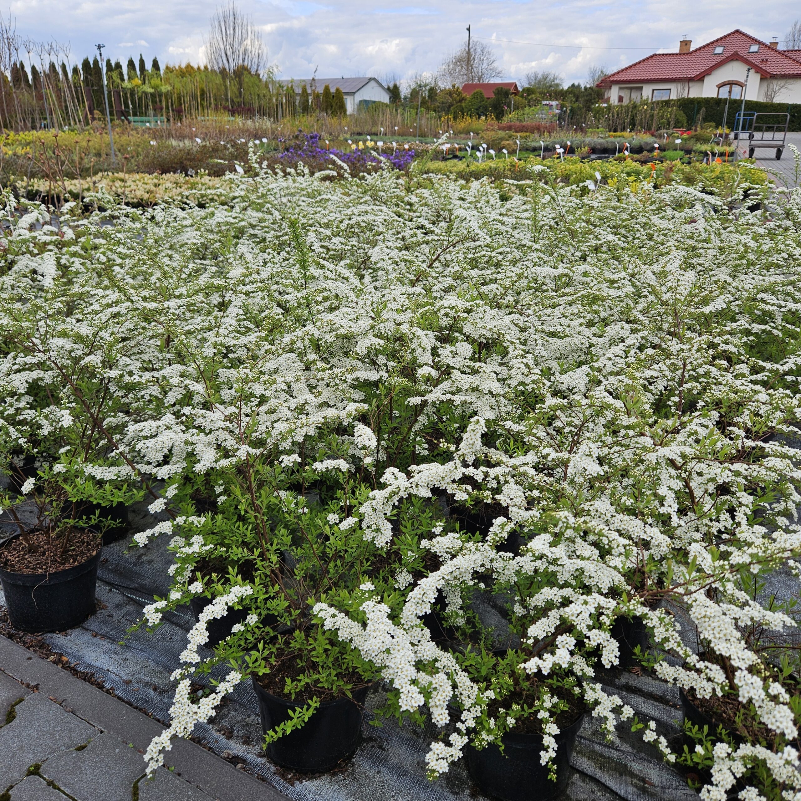 Tawuła szara ‘Grefsheim’ (Spiraea × cinerea ‘Grefsheim’) to niewielki, gęsty krzew liściasty o malowniczo łukowato przewieszających się pędach, dorastający zwykle do około 1,5–2 m wysokości i podobnej szerokości. Wczesną wiosną, już w drugiej połowie kwietnia, zeszłoroczne pędy niemal na całej długości obsypują się drobnymi, śnieżnobiałymi kwiatami, tworząc efekt kaskady. Kwitnienie rozpoczyna się jeszcze przed rozwojem liści, dlatego w tym czasie krzew wygląda jak całkowicie biały. Liście są wąskie, szarozielone, lekko owłosione, jesienią przebarwiają się na żółto. Najlepiej rośnie na stanowiskach słonecznych, choć toleruje półcień, w przeciętnych glebach ogrodowych o umiarkowanej wilgotności. Jest wytrzymała, dobrze znosi suszę i warunki miejskie. Cięcie wykonuje się po kwitnięciu, ponieważ pąki kwiatowe zawiązują się na pędach zeszłorocznych. Doskonale sprawdza się jako soliter, w swobodnych lub ciętych żywopłotach oraz w zieleni osiedlowej.
