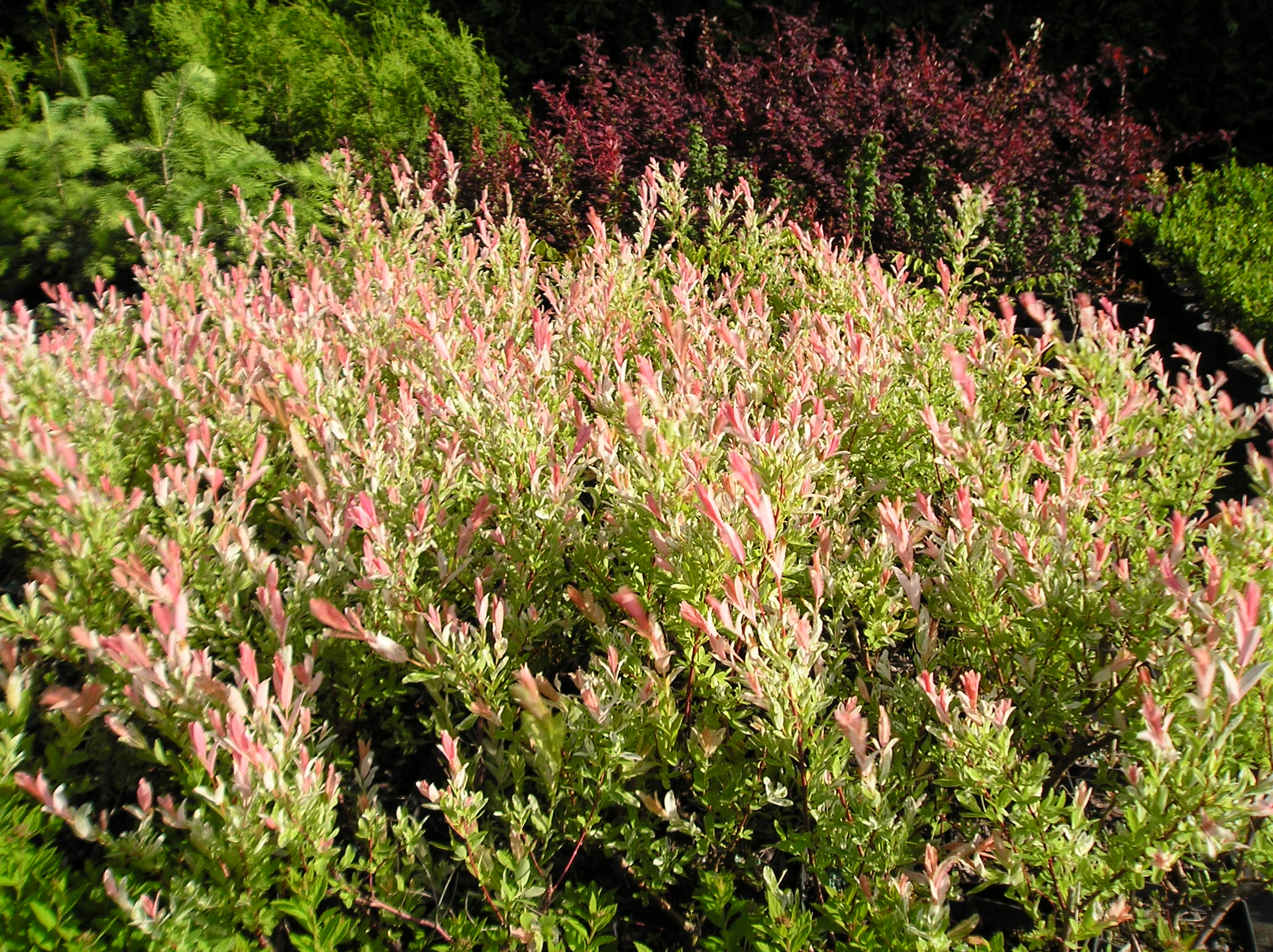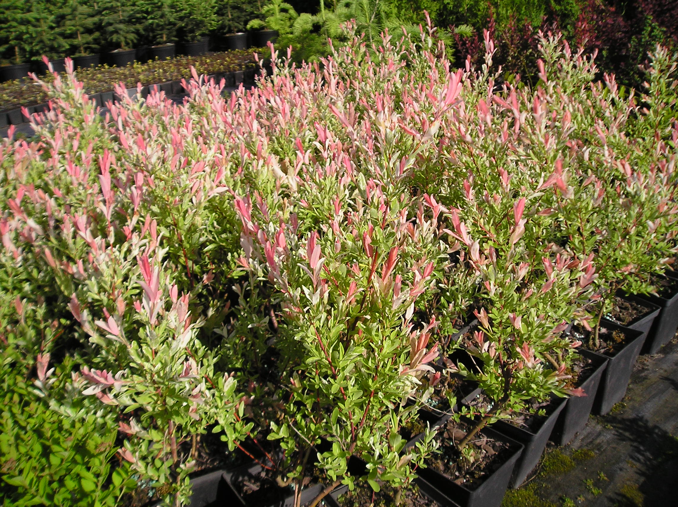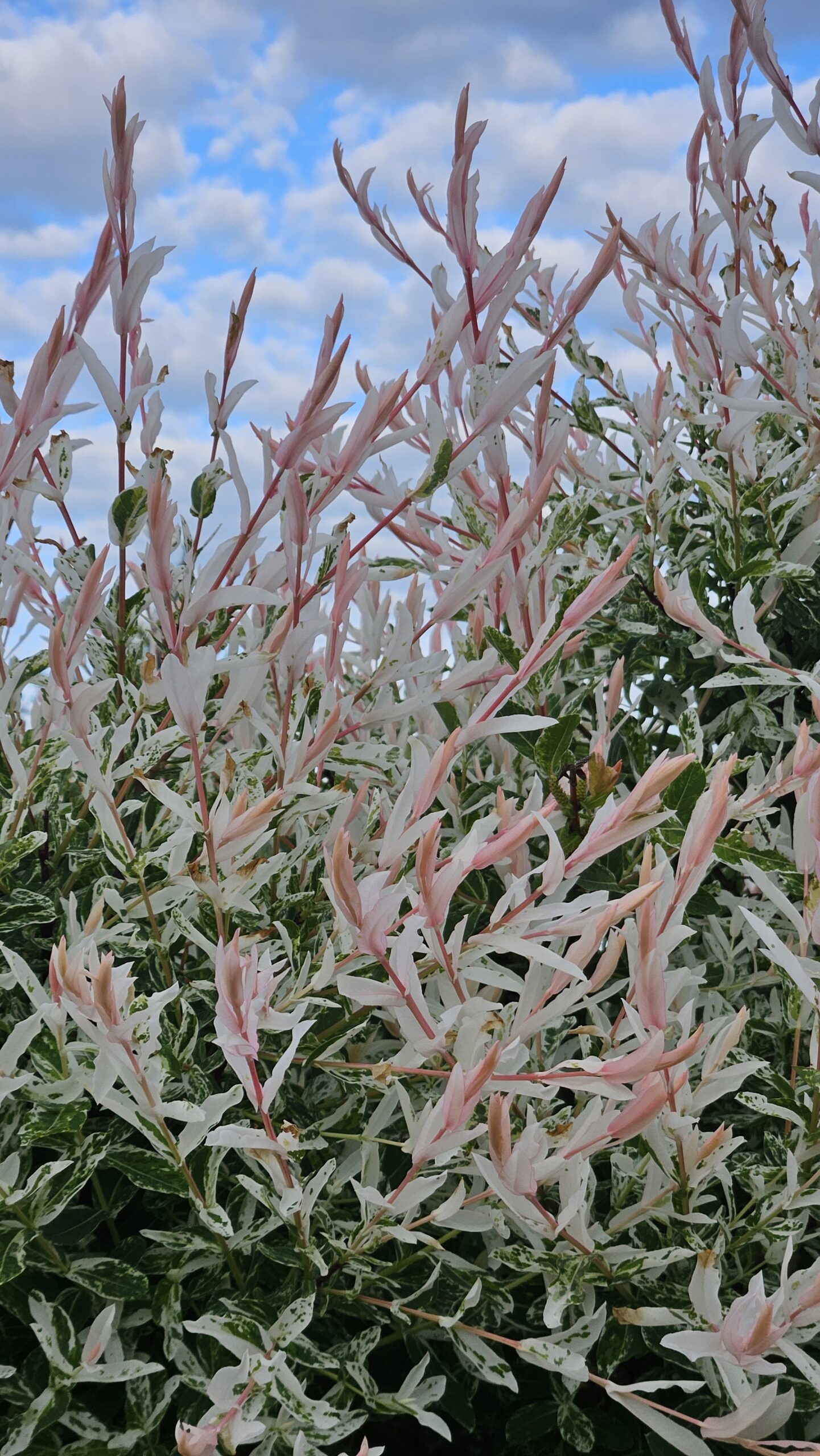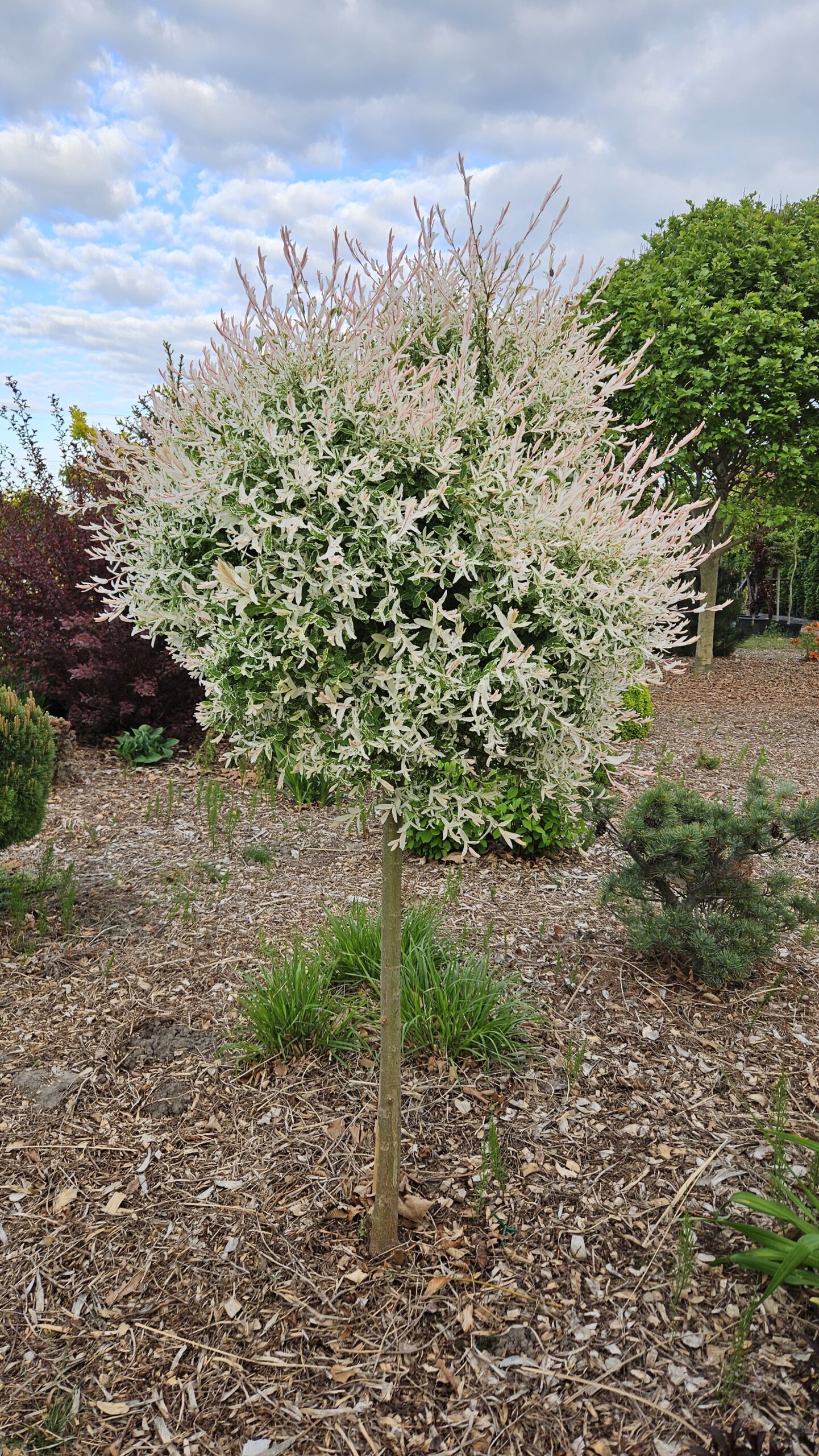 Wierzba całolistna ‘Hakuro-Nishiki’ (Salix integra ‘Hakuro-Nishiki’) to dosyć silnie rosnący krzew o kulistym pokroju i wyjątkowo dekoracyjnych liściach. Największy efekt daje wiosną i latem, gdy młode przyrosty przybierają intensywne odcienie różu, bieli i zieleni, stopniowo jaśniejąc wraz z dojrzewaniem. Pędy są cienkie, elastyczne, z wyraźnie czerwonawą korą, co dodaje roślinie uroku także poza sezonem wegetacyjnym. Rośnie szybko i dobrze reaguje na regularne cięcie, które pobudza wytwarzanie młodych, najbardziej wybarwionych pędów i pozwala utrzymać zwartą formę. Najlepiej czuje się na stanowiskach słonecznych, osłoniętych, w glebach żyznych, przepuszczalnych i stale lekko wilgotnych. Doskonale sprawdza się jako soliter, w grupach krzewów, na żywopłoty oraz w formie małego drzewka o kulistej koronie.