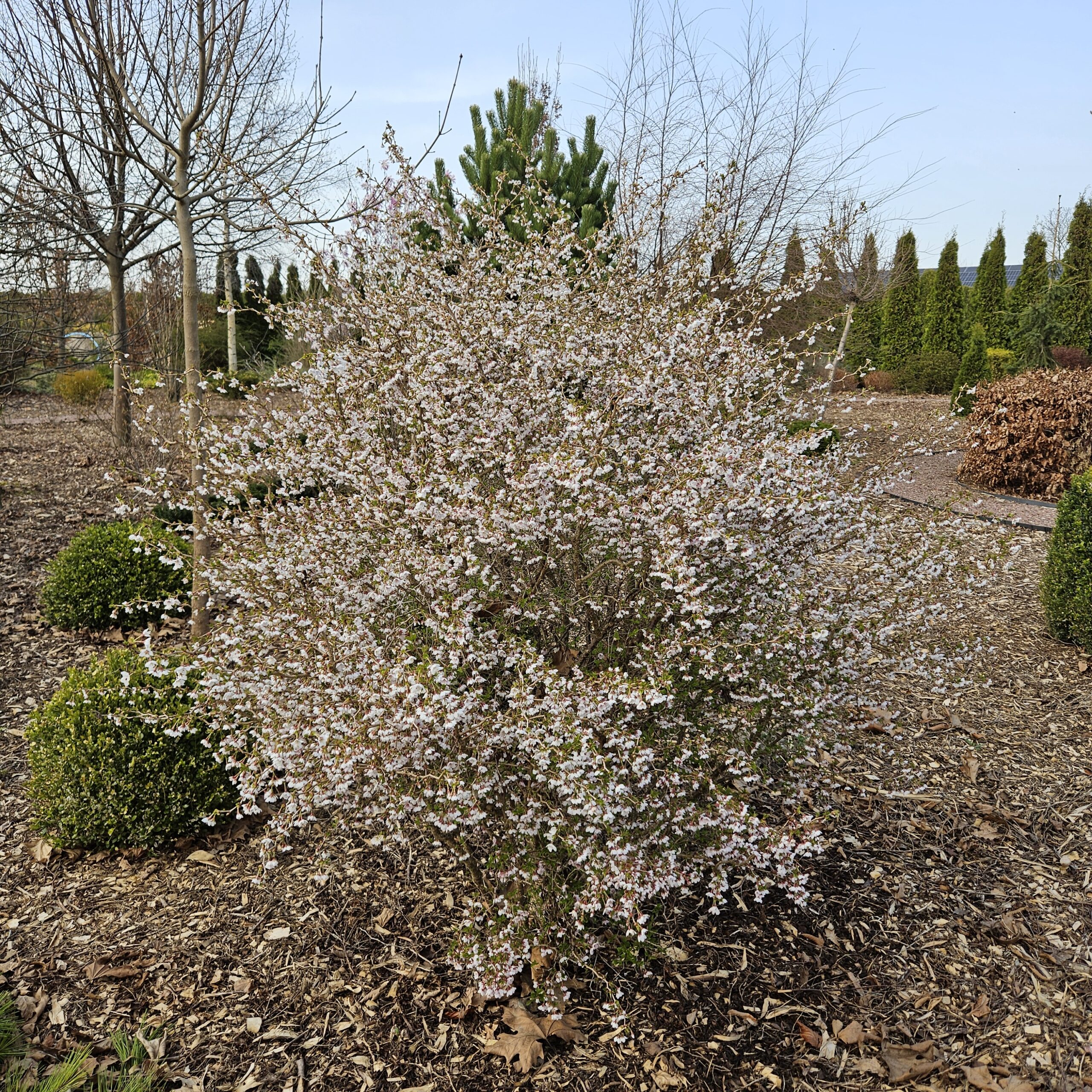 Wiśnia wczesna ‘Kojou-no-mai’ (Prunus incisa ‘Kojou-no-mai’) to wolno rosnąca, kompaktowa roślina ozdobna o bardzo charakterystycznych, cienkich i zygzakowato powyginanych pędach, dekoracyjnych także zimą. Najczęściej tworzy niski krzew lub małe drzewko szczepione na pniu, osiągając zwykle około 2,5 m średnicy. Wczesną wiosną, na początku kwietnia – jeszcze przed pełnym rozwojem liści – obsypuje się drobnymi, dzwonkowatymi kwiatami w odcieniach bieli i jasnego różu, delikatnie pachnącymi. Liście są niewielkie, jasnozielone, jesienią przebarwiają się na czerwono i pomarańczowo. Najlepiej rośnie na glebach żyznych, przepuszczalnych, umiarkowanie wilgotnych o odczynie od lekko kwaśnego do lekko zasadowego. Preferuje stanowiska słoneczne. Doskonała do małych ogrodów, nasadzeń pojemnikowych, rabat oraz jako soliter w miejscach eksponowanych.